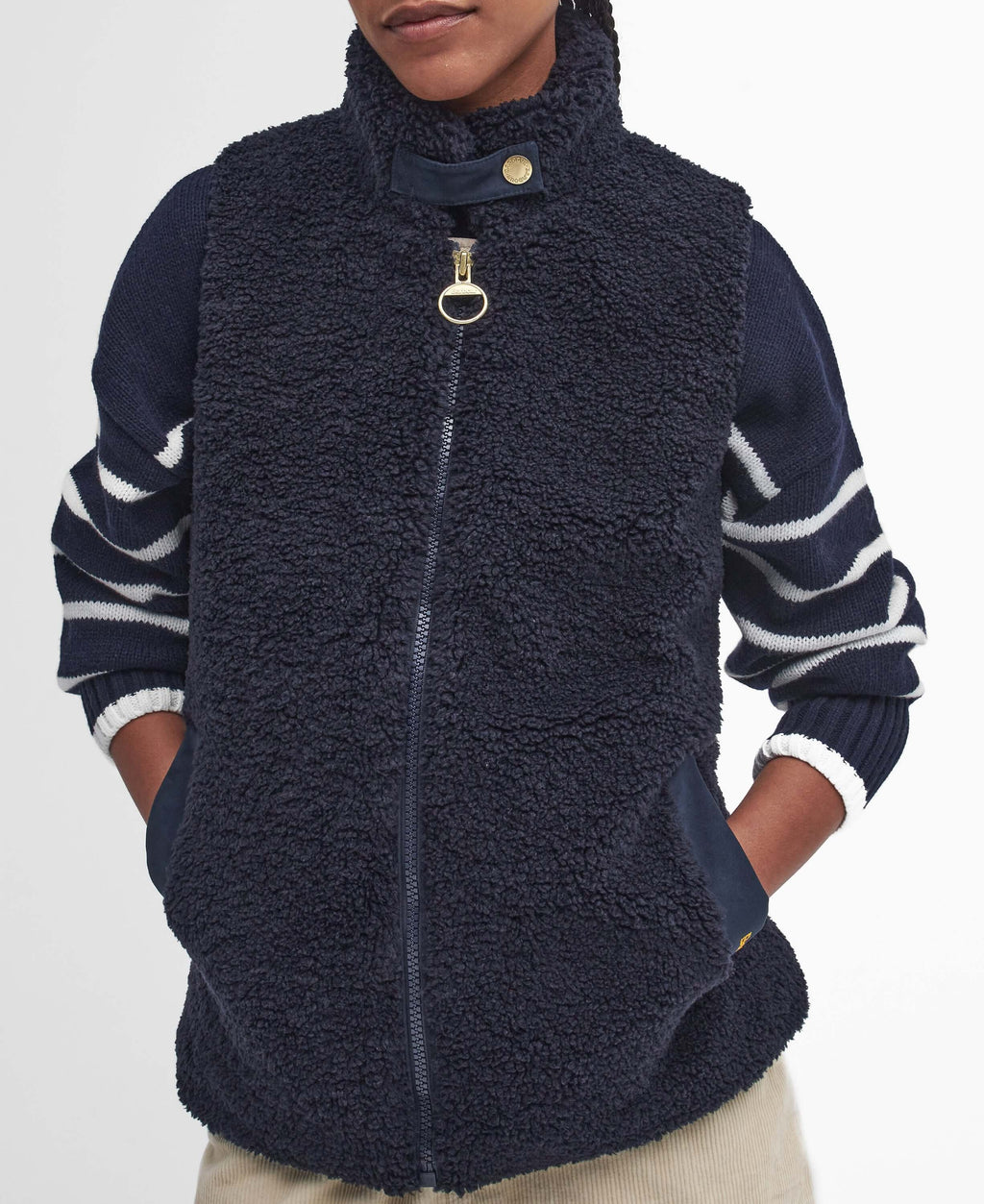 Elevate your layering game with the Barbour Elisha Gilet, a perfect blend of cozy teddy fleece and sophisticated quilting.