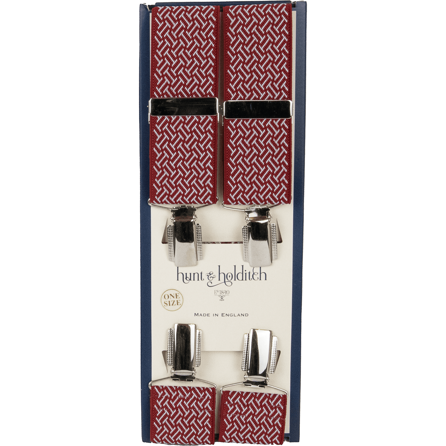 These Hunt & Holditch Chevron Clip Braces are an eye-catching addition to your outfit. Featuring a geometric chevron pattern and traditional four-clip fastening, they are crafted in England with durable adjusters and elastic webbing for everyday comfort.