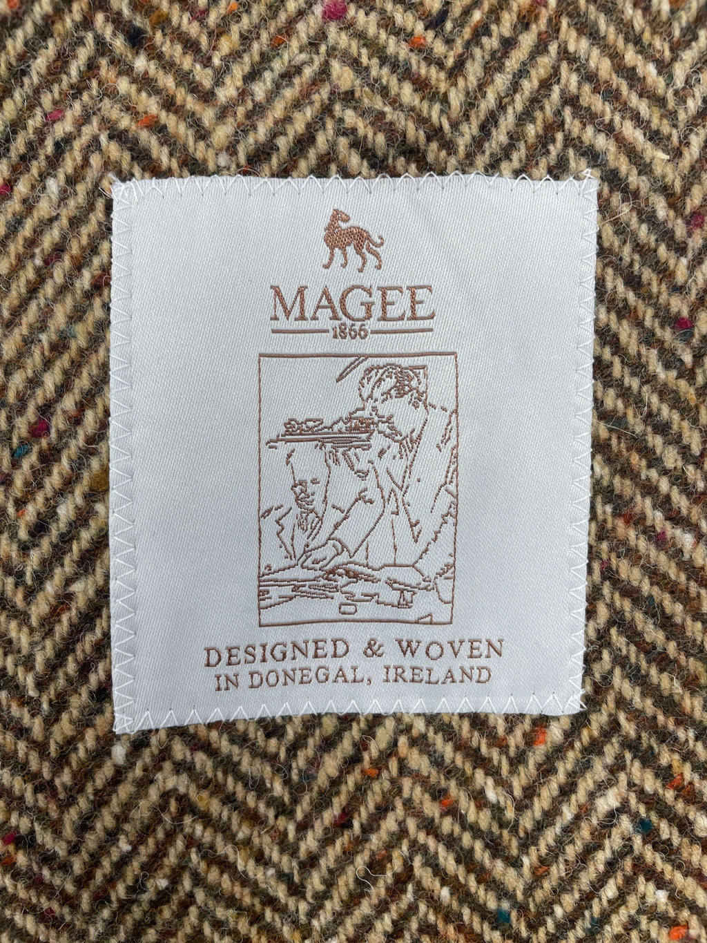 The Easky jacket is woven and finished at Magee's mill in Donegal using 100% wool tweed, featuring a rich brown and black herringbone pattern accented with colourful flecks unique to Donegal cloth. Its unconstructed interior gives a relaxed yet tailored look, making it ideal for cooler spring days and evening wear. With earthy tones and a classic cut, this piece lends itself easily to smart-casual layering.