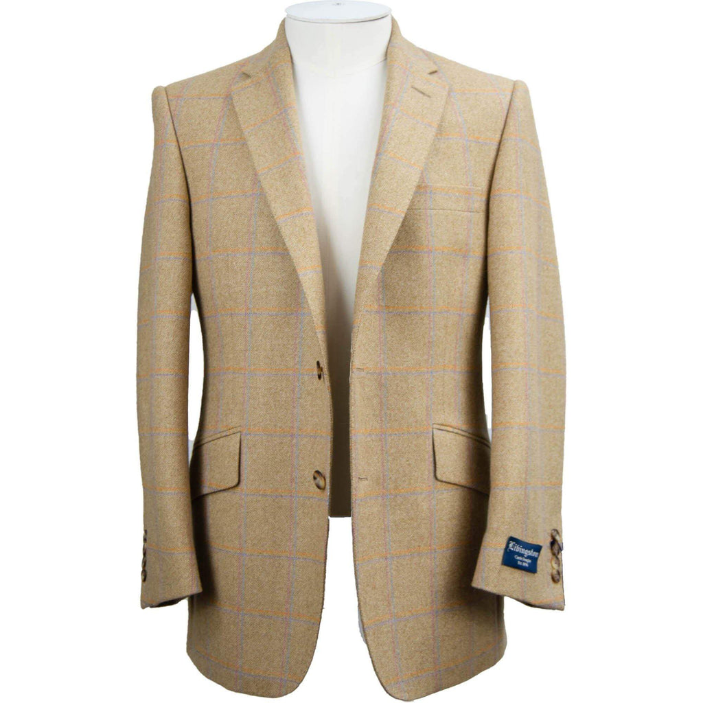 This refined sport coat by Livingston is crafted from premium Lovat Mill tweed, woven in Hawick from 100% wool. A subtle window check pattern on a butterscotch base gives the jacket a country-inspired elegance. Styled on a tailored Bladen Shelton block, it features slanted pockets, real horn buttons, a notch lapel, and a contrast purple lining for a distinctive finish.