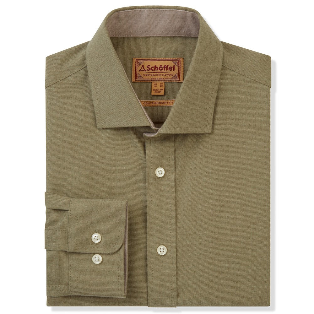 The Schöffel Newton Tailored Sporting Shirt in Olive is made from a warm cotton and wool blend, perfect for colder field days. With a classic cutaway collar, tailored fit and contrast detail at the collar and cuffs, it combines heritage styling with comfortable functionality. Ideal worn under tweed or technical layers.