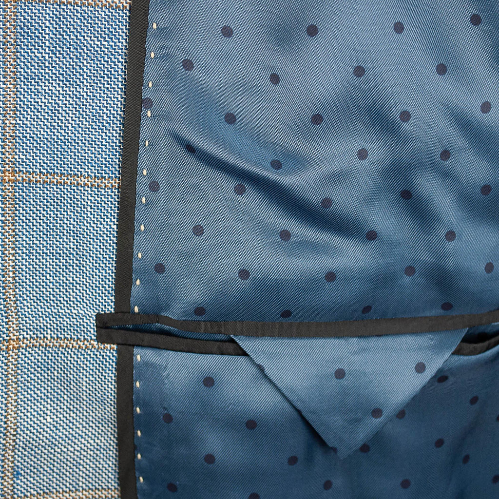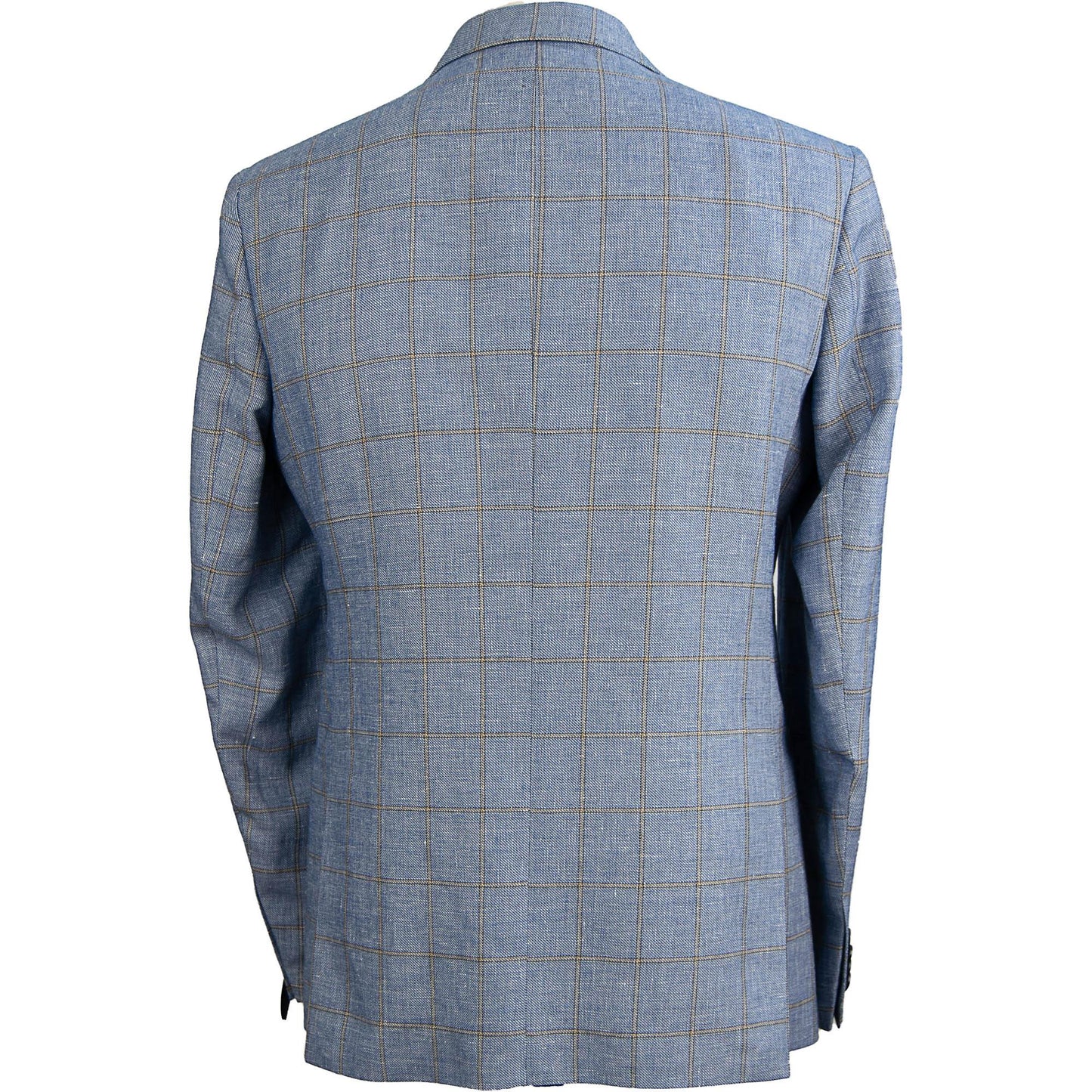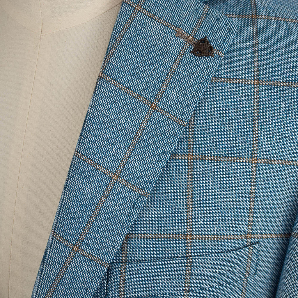 This Roy Robson two-button jacket blends the texture of linen with the structure of virgin wool, making it a smart choice for warm-weather occasions. Cut with a tapered lapel and finished with a decorative pin, it features two patch pockets, a welted breast pocket, and neat brown kissing buttons. Fully lined in viscose for a smooth feel, and styled with side vents for comfort in movement.