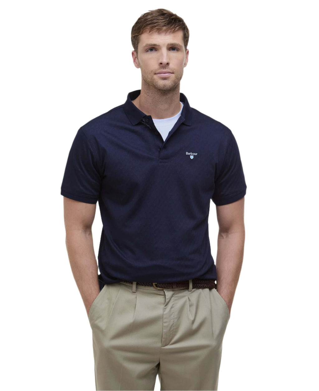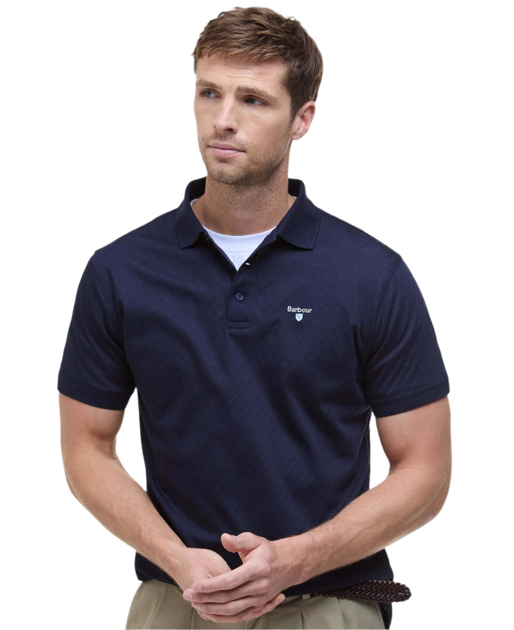 Featuring a knitted jacquard design, the Sutton Polo Shirt is cut to a tailored fit for a premium everyday staple. This polo shirt is finished with a Barbour crest embroidered branding to the left chest.