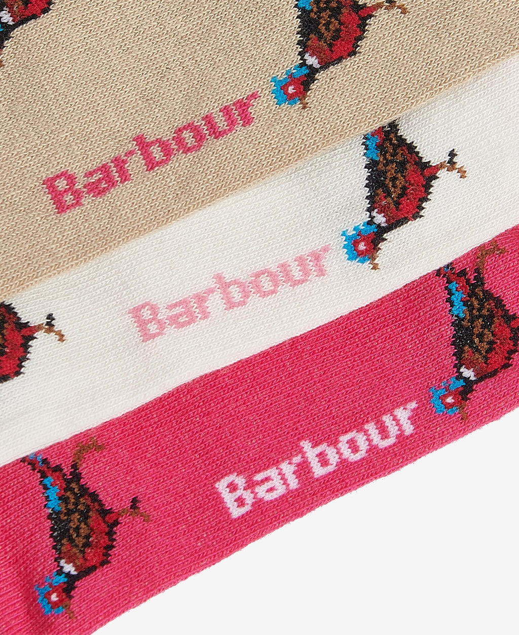 The Barbour Women's Pheasant Socks bring a playful touch to your everyday essentials, featuring a charming set of three pairs with unique pheasant designs and contrasting heel and toe colors. Crafted from a comfortable cotton blend, these socks provide softness and durability, while the Barbour logo elegantly graces the sole for a subtle brand touch. Perfect for adding character to any outfit, this set is ideal for gifting or keeping cozy all season.